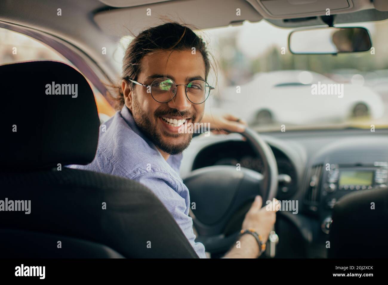 Cheerful Middle Eastern Young Man Taxi Driver Looking At Back Seat And Smiling At Camera Closeup Photo Copy Space Happy Arab Guy Enjoying His Brand Stock Photo Alamy
